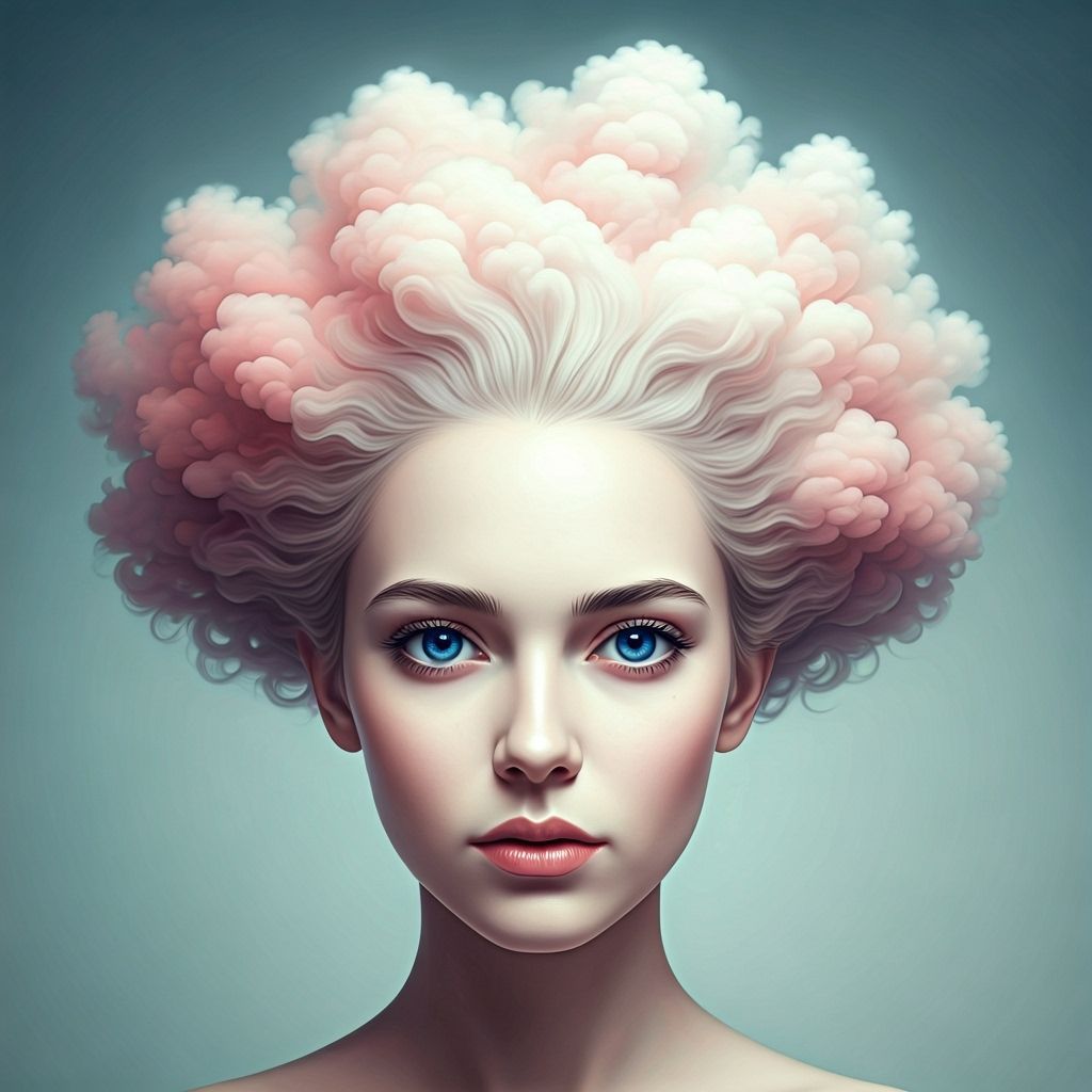 A striking picture of a woman with porcelain skin and sapphire eyes. Her pink and white hair is styled into a cloud-like sculpture in a high-contrast airbrush art style, against a hazy pale blue backdrop.