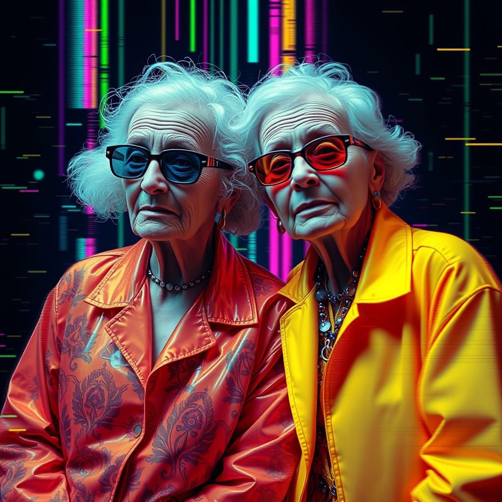 A digital image showing two elderly women in vibrant, glitched attire. The artwork features pixelation and digital noise in a cyberpunk aesthetic.