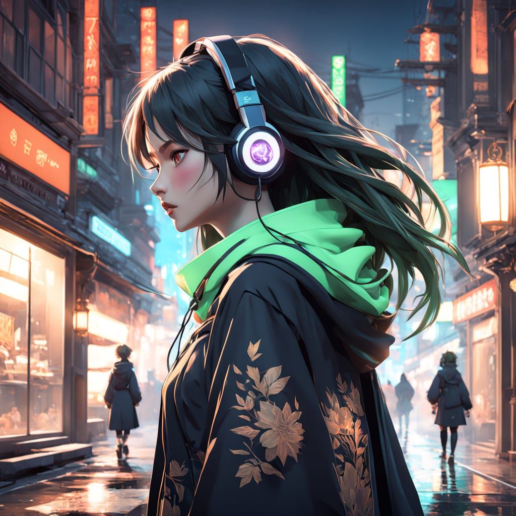 This image shows a young woman with headphones walking through a neon-lit Tokyo street with a snake coiled around her wrist, rendered as 3D anime art. The style is reminiscent of Genshin Impact.