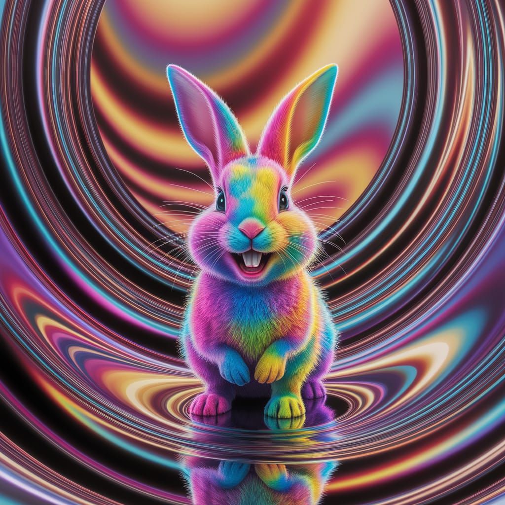 This image shows a surreal scene of a joyful chromatic bunny reflected in a maze of curved, shimmering vortices, with each layer blooming in saturated colors and soft motion blur, set against a warm, gradient background.