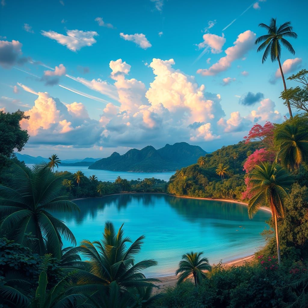 This serene image depicts a tropical paradise with a crystal clear lake, surrounded by a lush and vibrant forest with a variety of colorful trees, including golden oaks, silver willows, and crimson maples, set against a stunning sunset backdrop with pastel-colored clouds and an orange sky, evoking the dr...