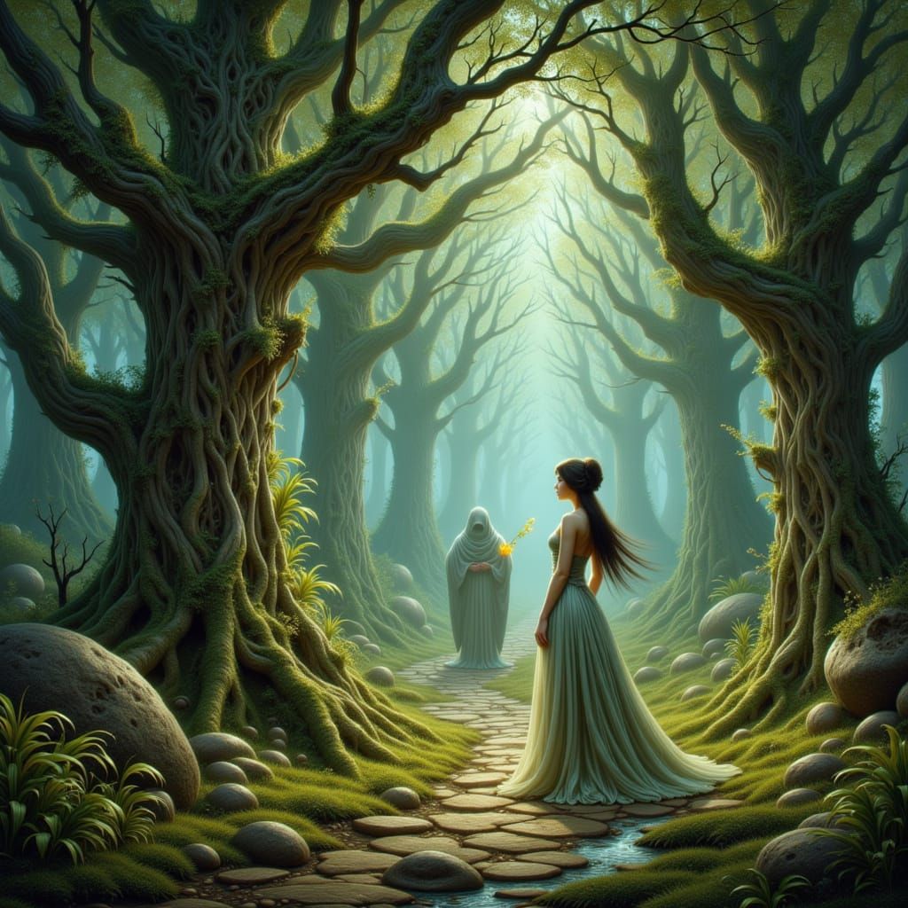 This image shows a lone figure in an elegant cloak at a forest crossroads, holding a glowing wildflower. Rendered as an oil painting with bold linework and a dreamlike atmosphere.