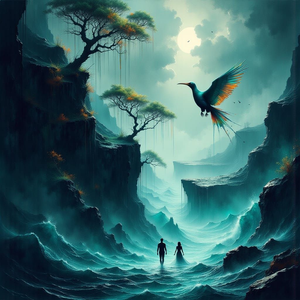A dramatic scene of two silhouetted figures diving into a vibrant, churning sea beneath a massive cliff. The image features magical, ethereal lighting and a hyper-realistic style.