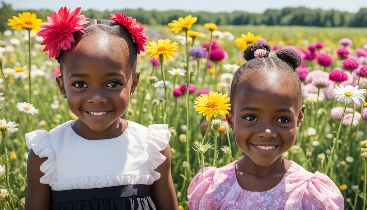 This image depicts two young girls, one white and one Black, celebrating a birthday in a flower-filled field. They are dressed in party attire, enjoying an outdoor celebration.
