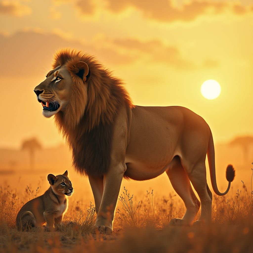 A majestic lioness in Pakistan's Cholistan Desert embodies the strength of village women. The scene captures her daily life, from dawn patrols to interactions with nomadic life under vibrant sunsets.
