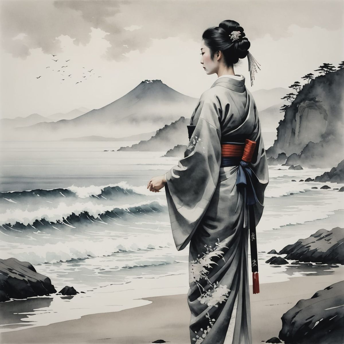 This image shows a geisha in traditional dress standing by the sea. The artwork is in a minimalist style, reminiscent of traditional ink wash painting with soft monochrome tones.