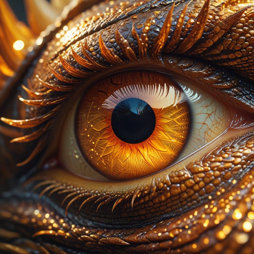 This image shows a macro photograph of a dragon's eye. The golden iris glistens with shimmering metallic flecks, and the scales are softly lit in warm golden light. Rendered with high detail in a golden realism style.