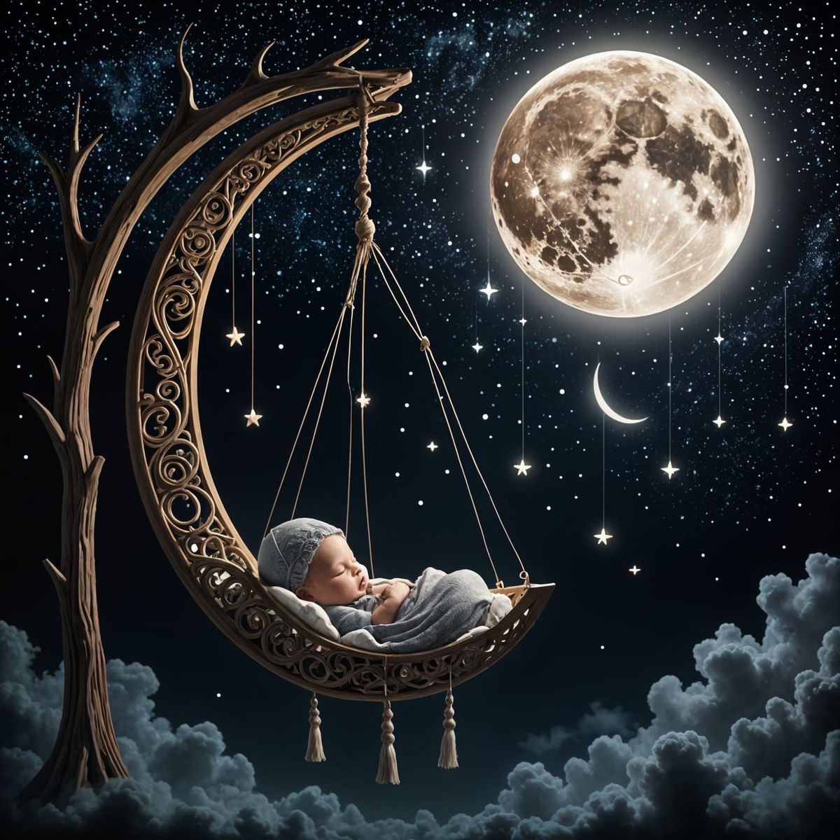 A dreamy image shows a baby sleeping peacefully in a cradle suspended from a giant half-moon against a dark, starry sky. Dynamic lighting enhances the enchanting, emotional ambiance.