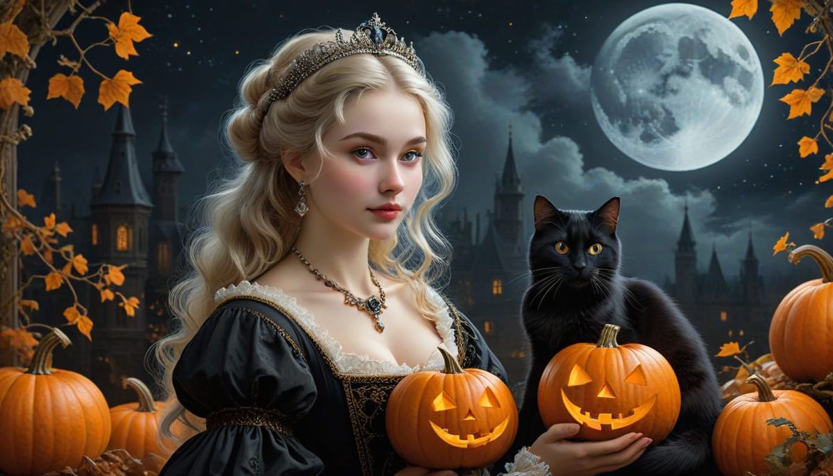 This digital painting features a pale princess with a black cat and pumpkin, set against a moonlit night. The artwork has intricate lines and a romantic, intriguing atmosphere, rendered in a style reminiscent of Rembrandt.