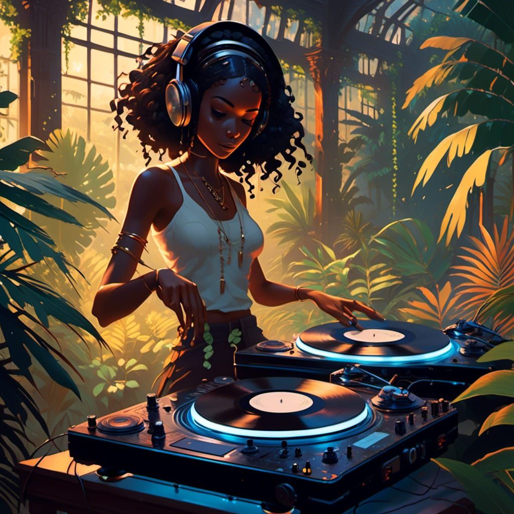 A vibrant anime-style image of a Black woman DJing at a party amidst lush tropical plants. This digital artwork showcases key visual elements of Japanese manga and anime art.