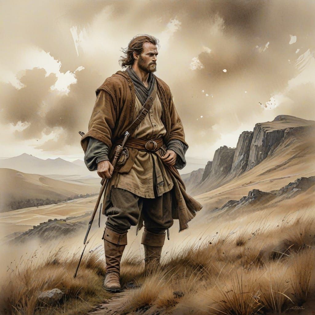 This sepia watercolor painting features a detailed highlander in rugged clothing standing on a windswept hill. The artwork uses muted tones and ink wash for an evocative atmosphere.