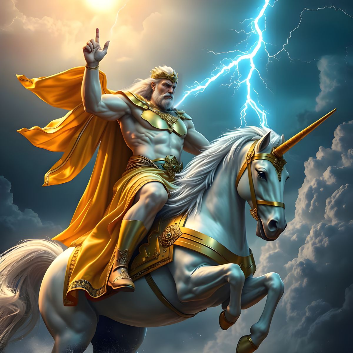 This hyperrealistic image shows Zeus, the Greek God, clad in iridescent gold, riding a majestic unicorn and casting a lightning bolt from the heavens.