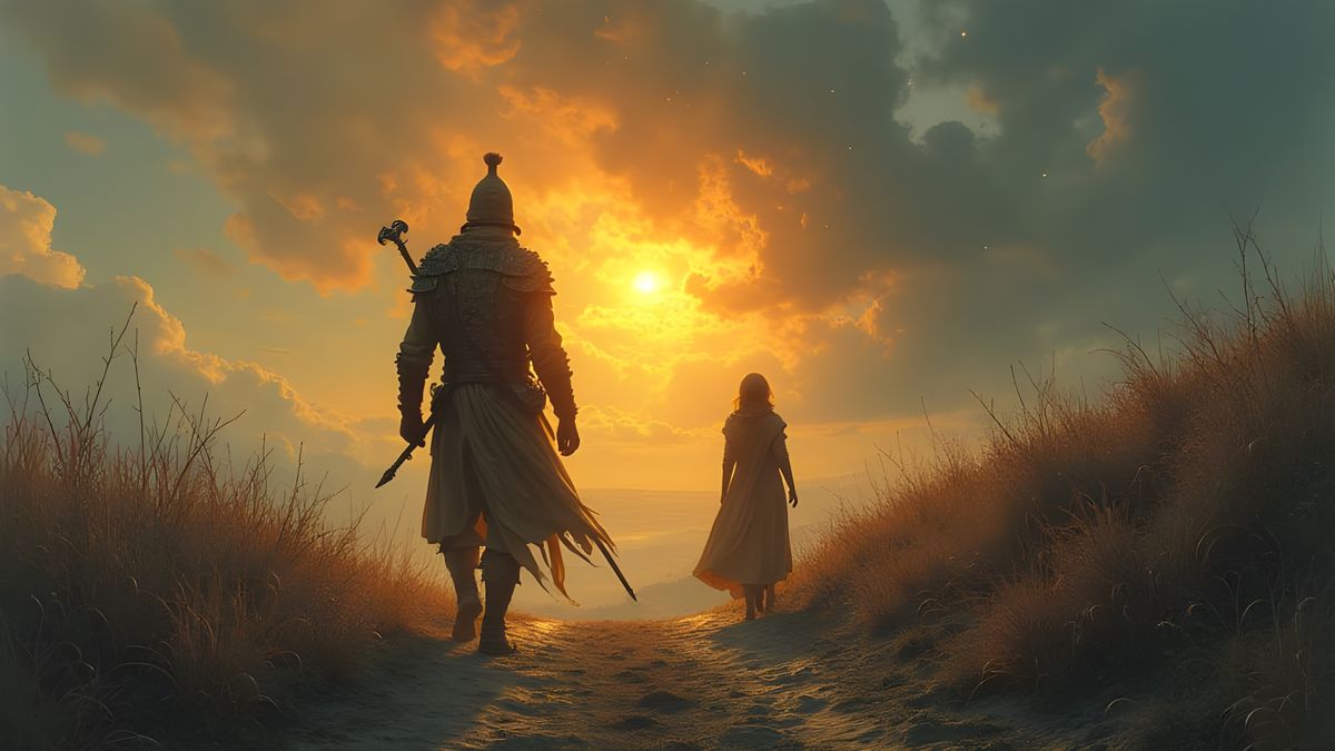This image shows a heroic journey through a post-apocalyptic landscape, where light and darkness clash. The pair carry a golden flame that dispels mist and sets ancient runes ablaze in the air, as they traverse burning fields, frozen lakes, and ascend to a mountain peak where stars are reflected in their...