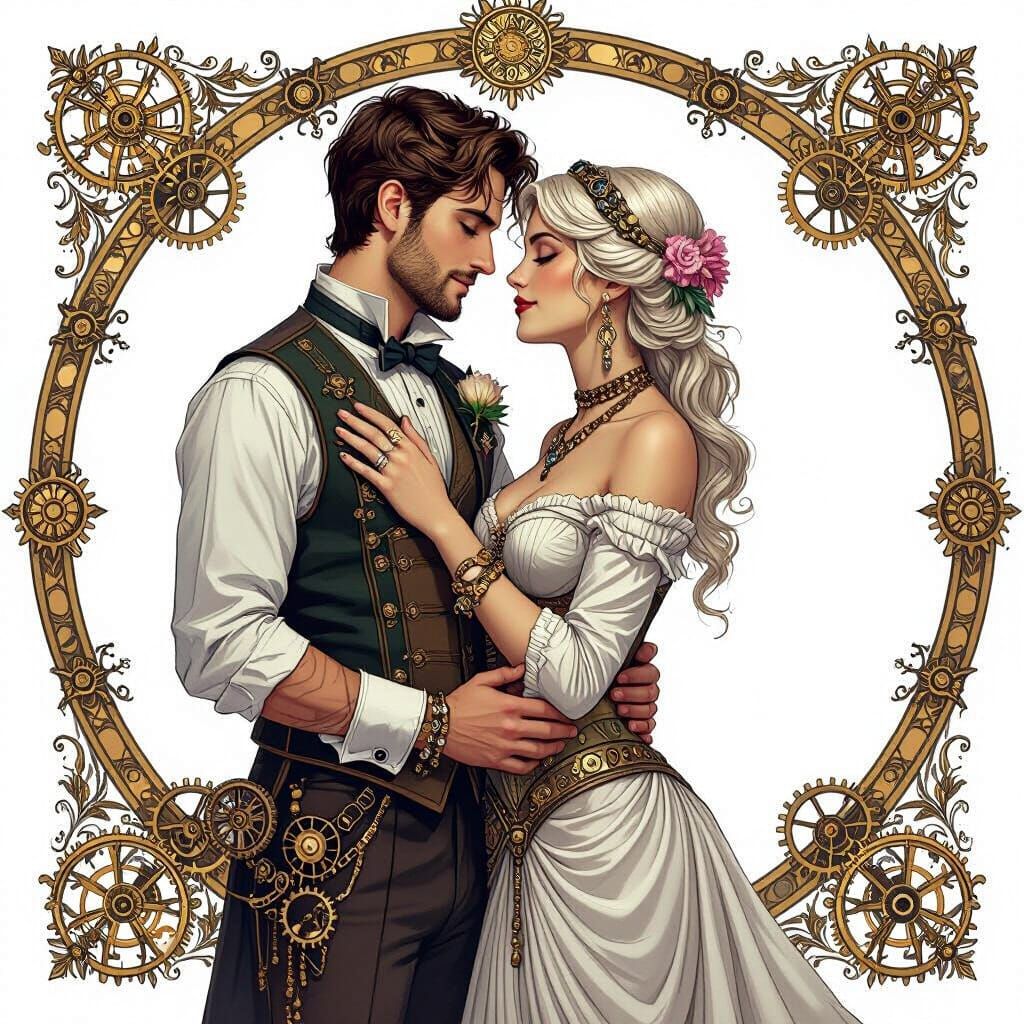 This image features a whimsical steampunk couple, adorned with clockwork gears and ornate jewelry, in a loving embrace. Soft lighting highlights intricate details and floral elements against a white background, inspired by Art Nouveau.