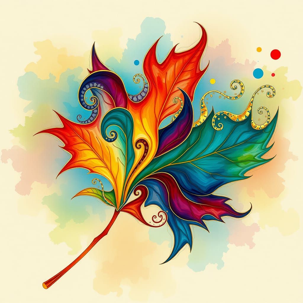 A surreal image of a vibrant maple leaf featuring fractal patterns on a watercolor backdrop. Golden outlines accentuate the leaf in a dreamlike Chagall-esque style.