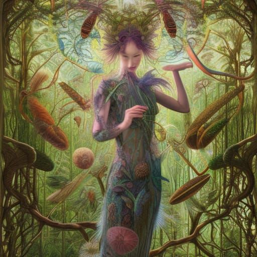 This image shows a fantastical grasshopper-human hybrid woman immersed in a dense mycelium network, set against a warped perspective of a forest. The artwork is rich in detail and color.