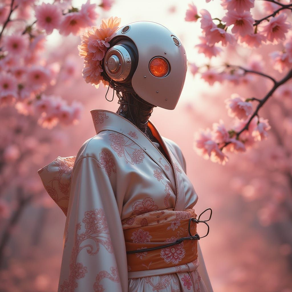 A cyborg in a floral kimono stands in a cherry blossom garden. The image blends art nouveau curves with cyberpunk futurism and sleek digital art, using pastel hues and metallic accents.
