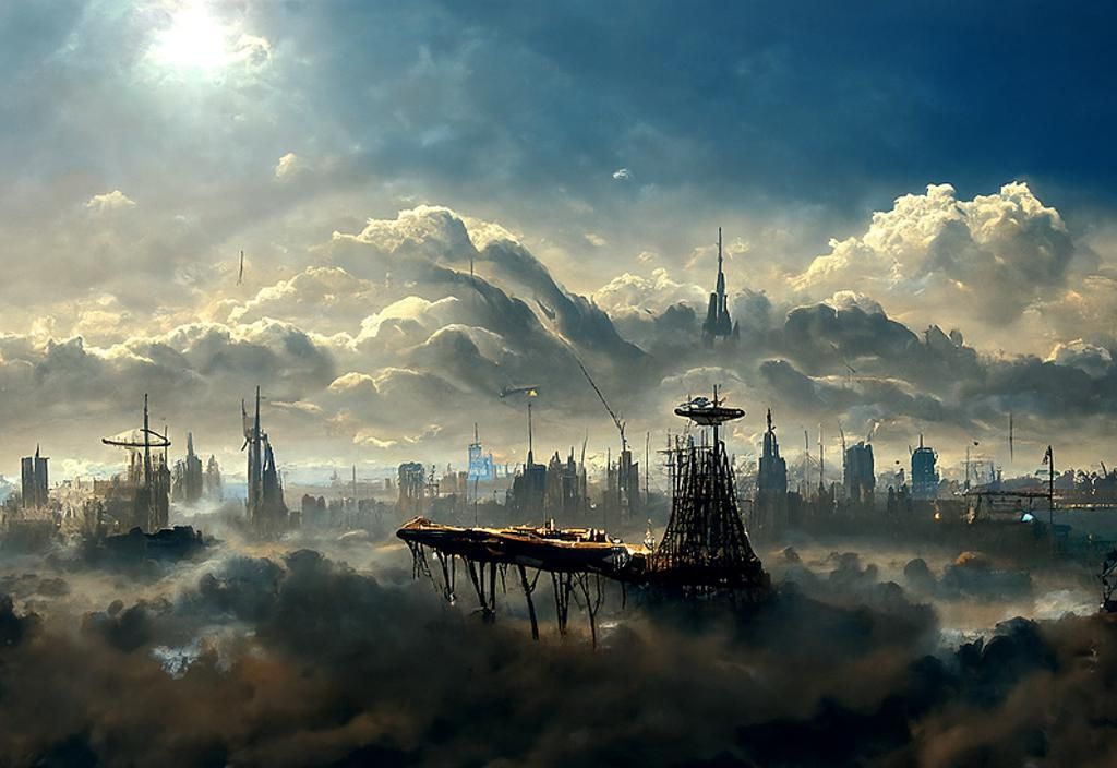 A metropolis, towering through luminous backlit purple clouds, supervised by an advanced spaceship from an alien civilization detailed digital art, painting by James Gurney, & Greg Rutkowski. Mysterious stygian cityscape by Ivan Aivazovsky made with Blender, old bridge with broken pillars & rigging
