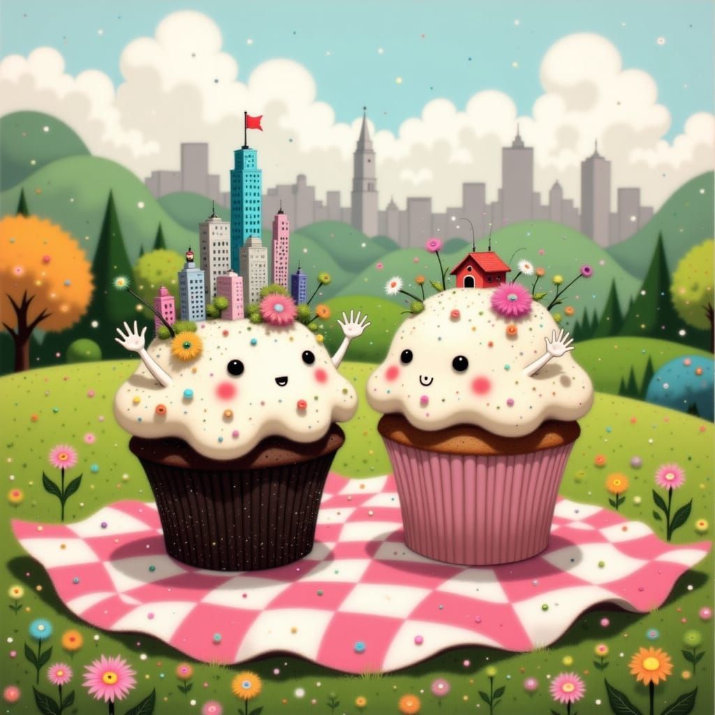 This charming illustration depicts an anthropomorphic city cupcake melting with affection for a countryside cupcake. Rendered in a detailed, whimsical storybook style with a romantic color palette.