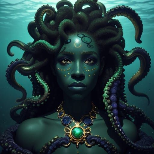 Generate unique African American Ursula images with emerald and gold tentacles. Free and easy AI art creation.