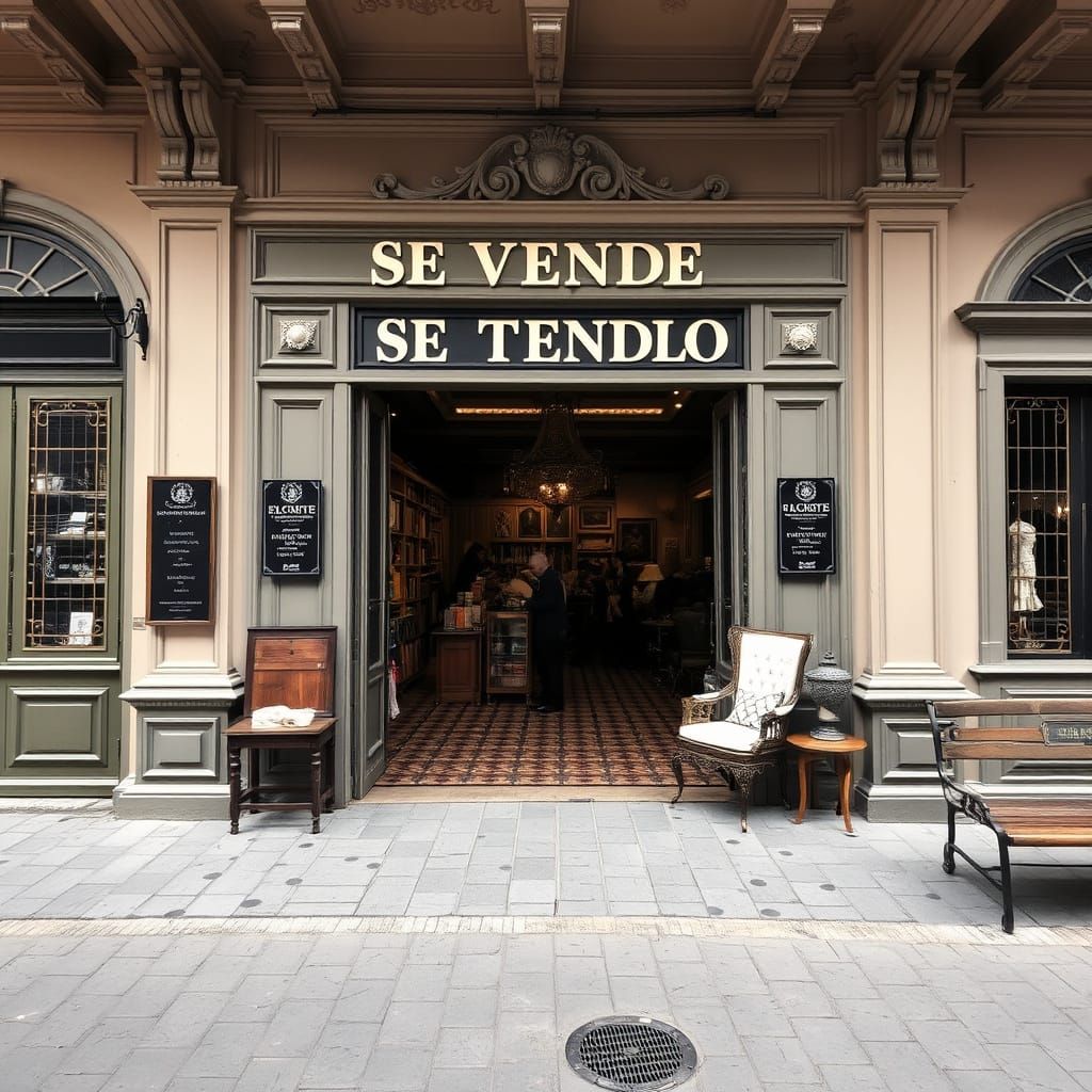 This image shows a Victorian-style antique shop with a "For Sale" sign in gold lettering. The design evokes Rococo and Art Nouveau aesthetics, resulting in an elegant visual.