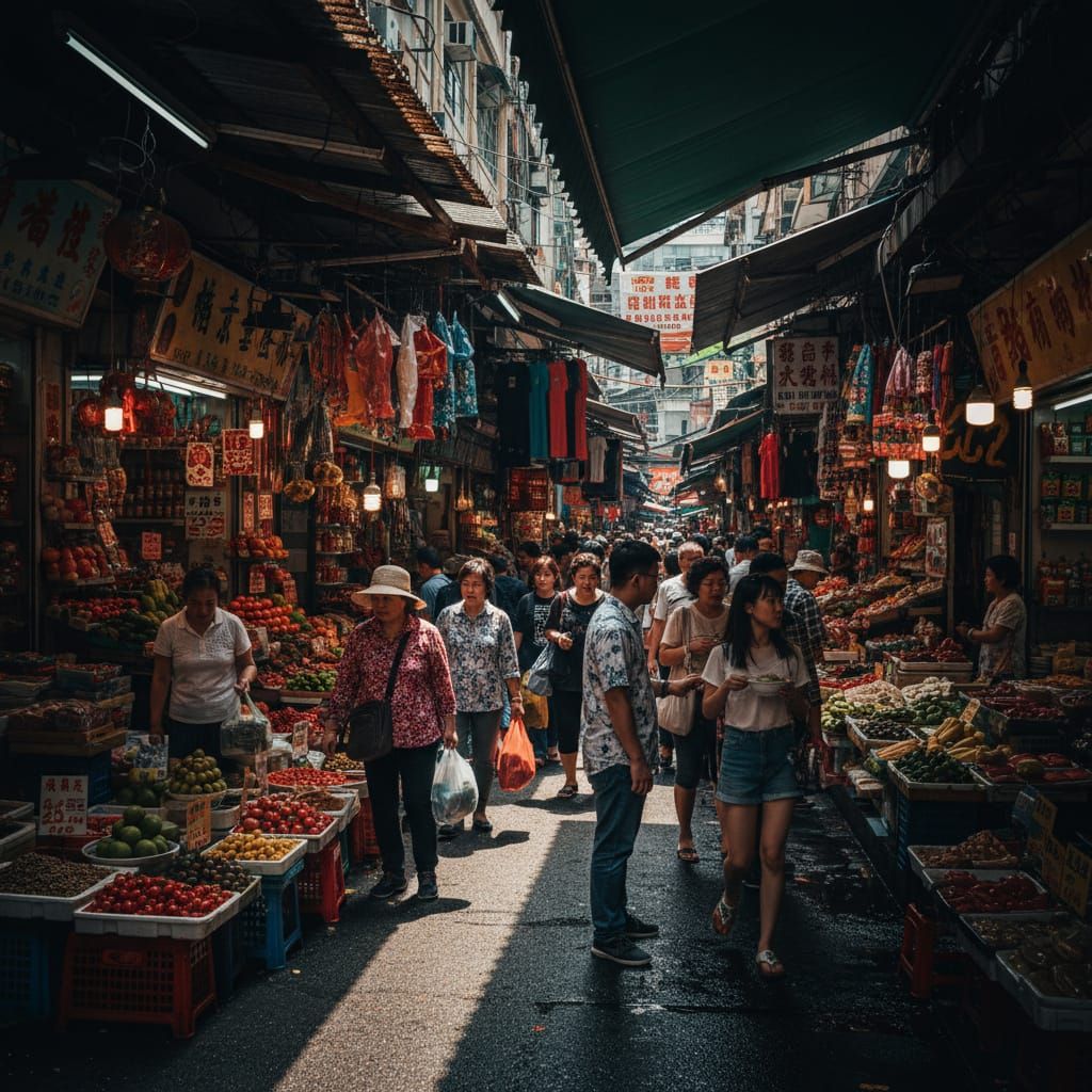 This image showcases a bustling Asian street market filled with colorful shops and interacting people. Photographed with dramatic natural light and deep shadows, it captures candid moments of daily life.