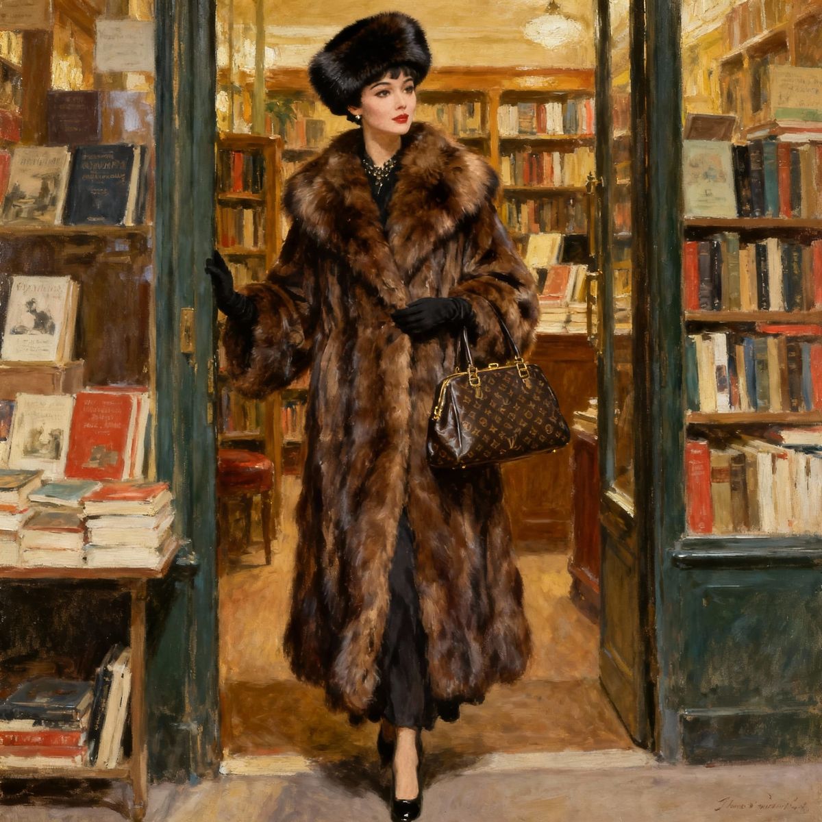 This image depicts a sophisticated woman in a luxurious fur coat, mink hat, and designer handbag entering a bookstore. Rendered with refined realism and intricate detail.