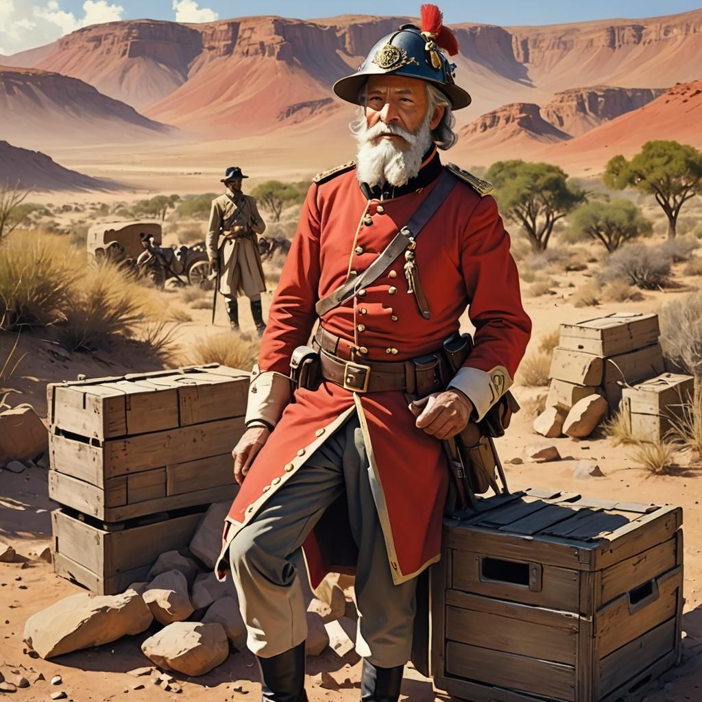 This image shows an elderly man with a beard dressed in a red British colonial uniform from the mid-1800s, striking a military pose in a desert setting with warm, vivid colors, resembling cel-shaded anime art.