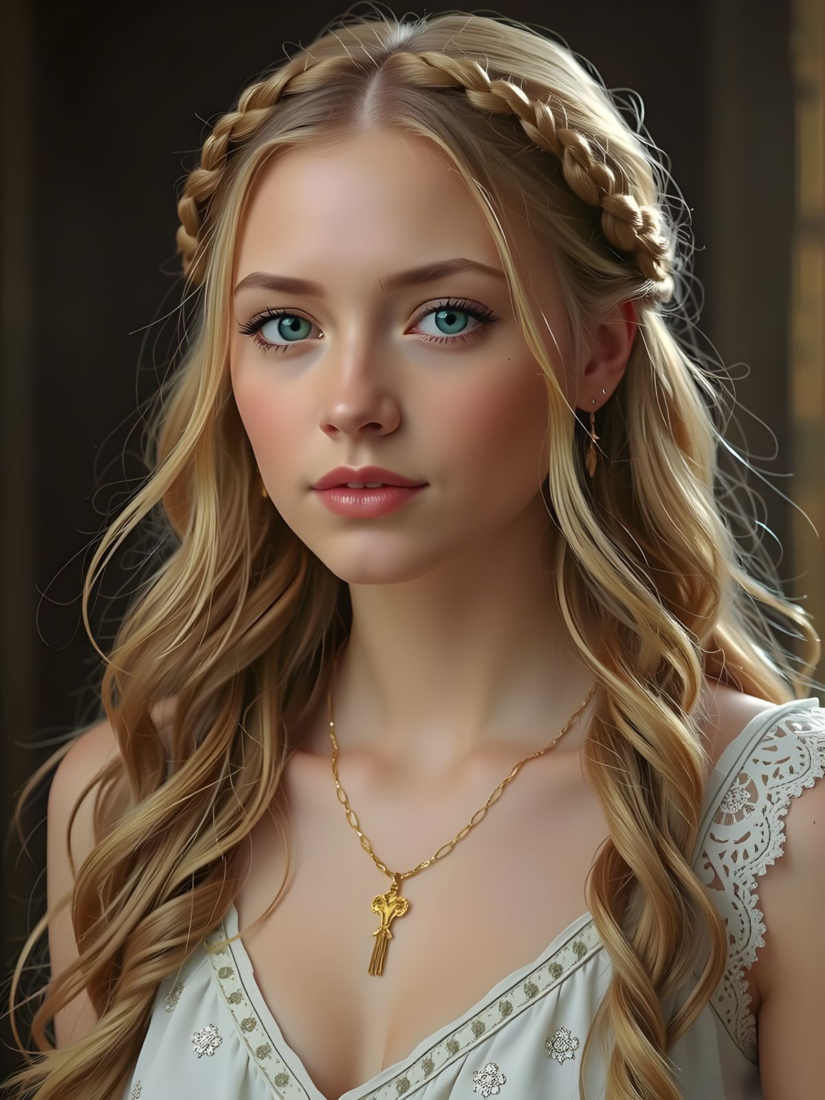 A portrait of a beautiful young woman with flowing blonde hair and delicate braids. The image captures her radiant warmth, elegant poise, and striking features.