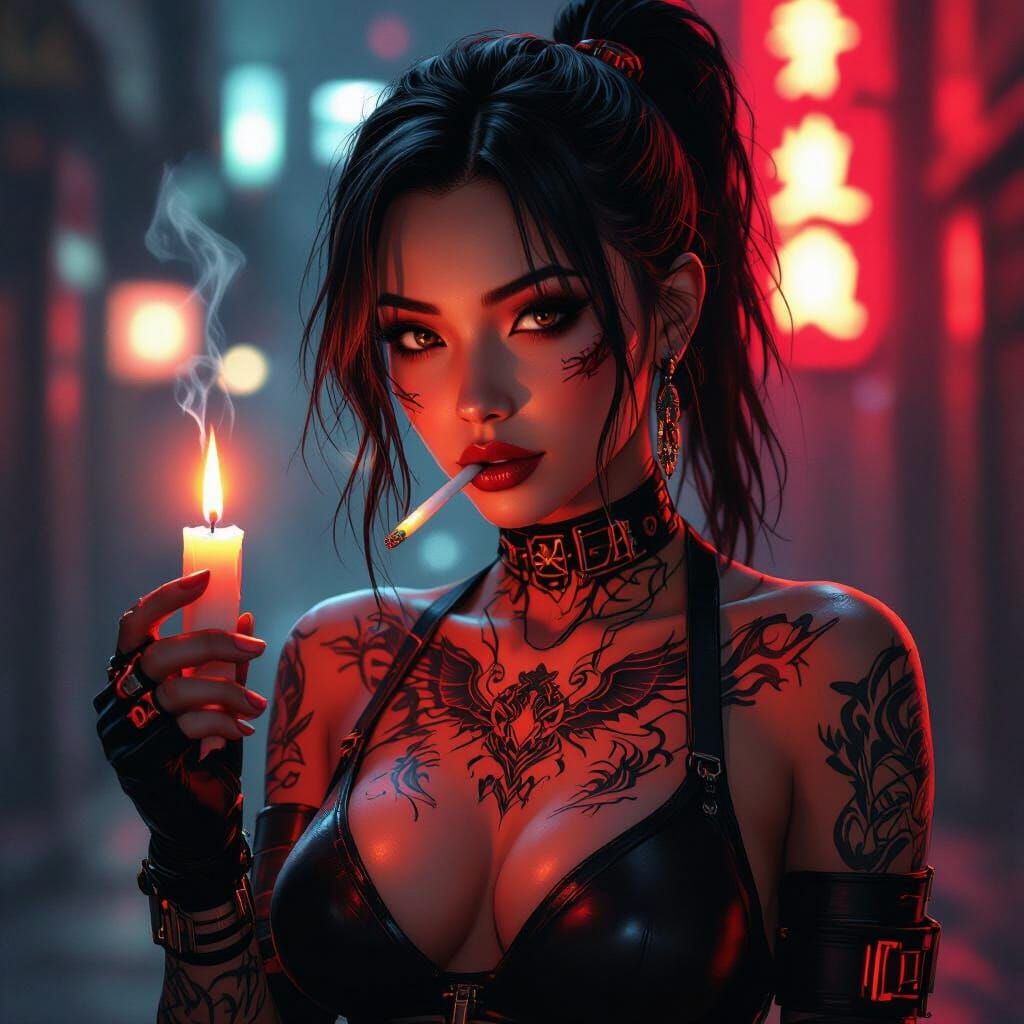 This image shows a cyberpunk woman with dragon tattoos holding a candle and smoking. The aesthetic is influenced by anime and cinematic styles, featuring neon red lighting and sharp shadows.