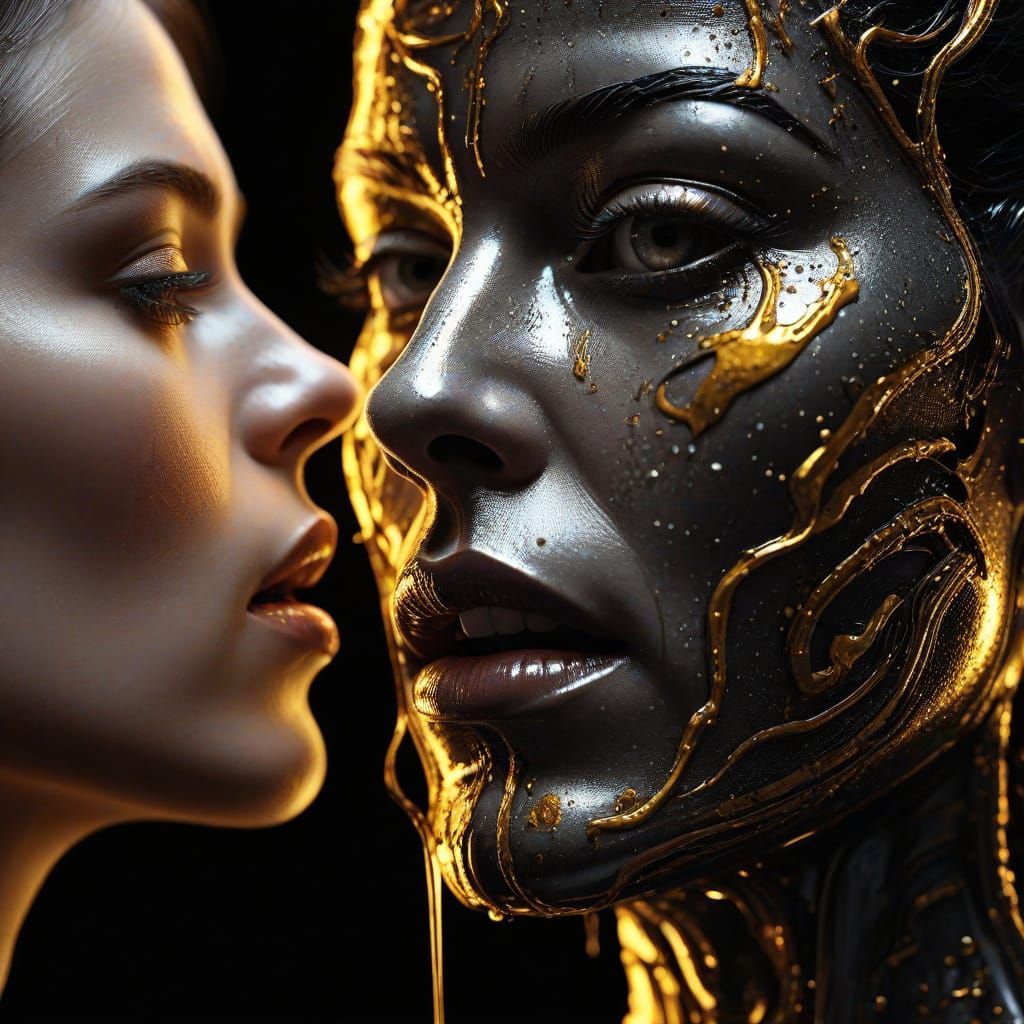 A striking picture of a woman and a pepper with glossy reflections on a black surface. The image features golden liquid splashes and bold neon colors in a surreal, hyper-realistic style.
