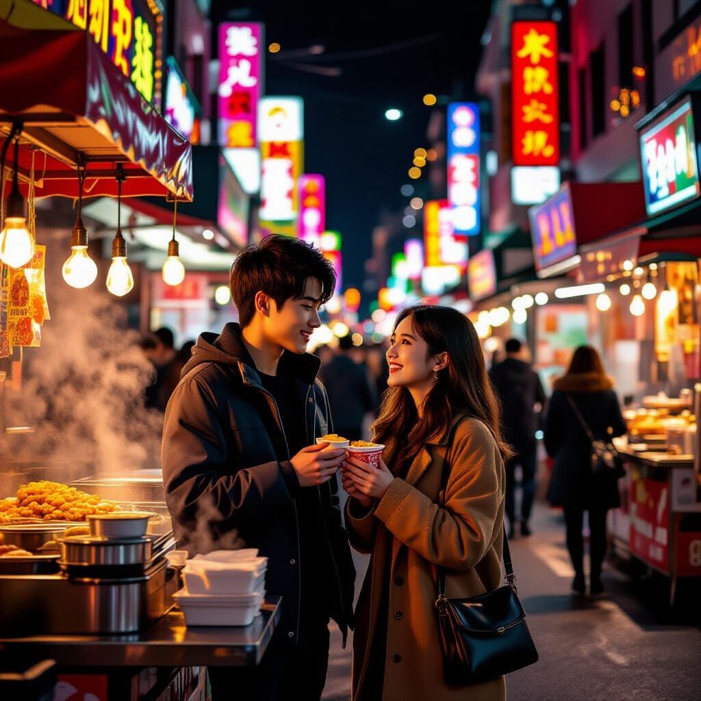 This image shows a vibrant Asian night market scene. A young couple shares a snack by a food stall, bathed in golden light. The artwork features intricate details and a romantic atmosphere in a painterly style.
