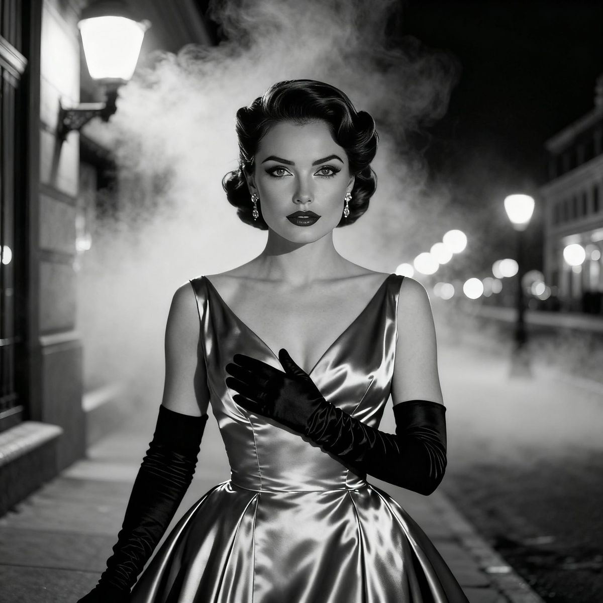 Description: A haunting black-and-white portrait set in the 1950s. A woman stands outside on a cold night, her satin gown and black silk gloves capturing the elegance of quiet luxury. Streetlamps glow faintly behind her, mist curling through the air. Her vivid eyes — the only color in the frame — glow with lifelike depth, drawing the viewer in. A vision of cinematic glamour and timeless fashion, frozen in a moment of winter’s chill.