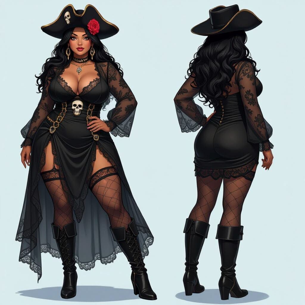 A cel-shaded anime-style image of a chubby Dominican pirate captain in a see-through lace dress and skull motif. This dynamic artwork features vibrant colors and meticulous details in a Studio Trigger aesthetic.