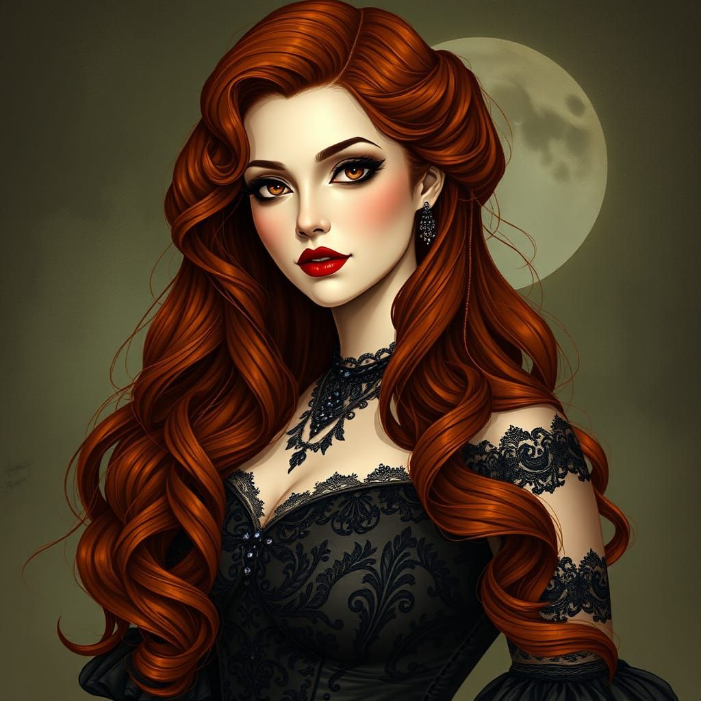 This image depicts a captivating woman with a curvaceous figure, rich auburn hair, and porcelain skin, exuding an ethereal aura and entrancing presence, reminiscent of sensual and mystical illustrations in the style of Victorian-era artists.