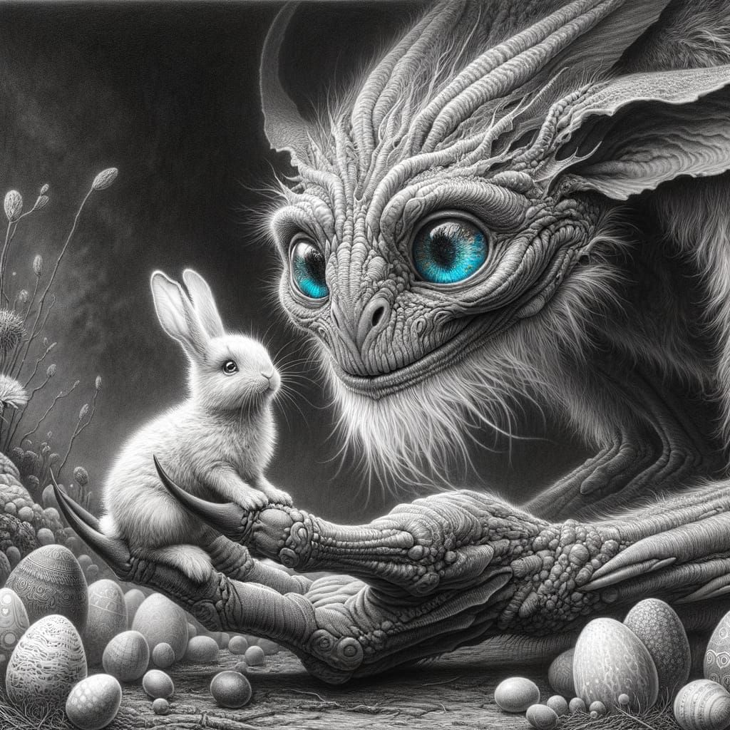 This detailed pencil drawing depicts a gentle, fantasy creature cradling a miniature Easter Bunny in a captivating, grayscale scene. The creature's sparkling blue-green eyes radiate warmth and curiosity, creating a sense of enchanting camaraderie.