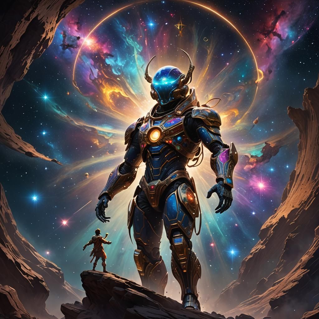 A vibrant image of a cosmic humanoid amidst stars, reaching for a newborn star. The artwork features dynamic lighting, intricate details, and complementary purple and yellow colors, reminiscent of dark fantasy concept art.