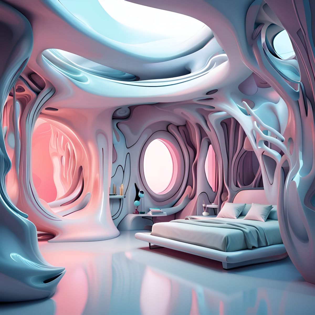 This image shows a surreal, futuristic bedroom in a space-punk aesthetic. Abstract architecture and flowing, melting shapes create a dreamlike atmosphere.