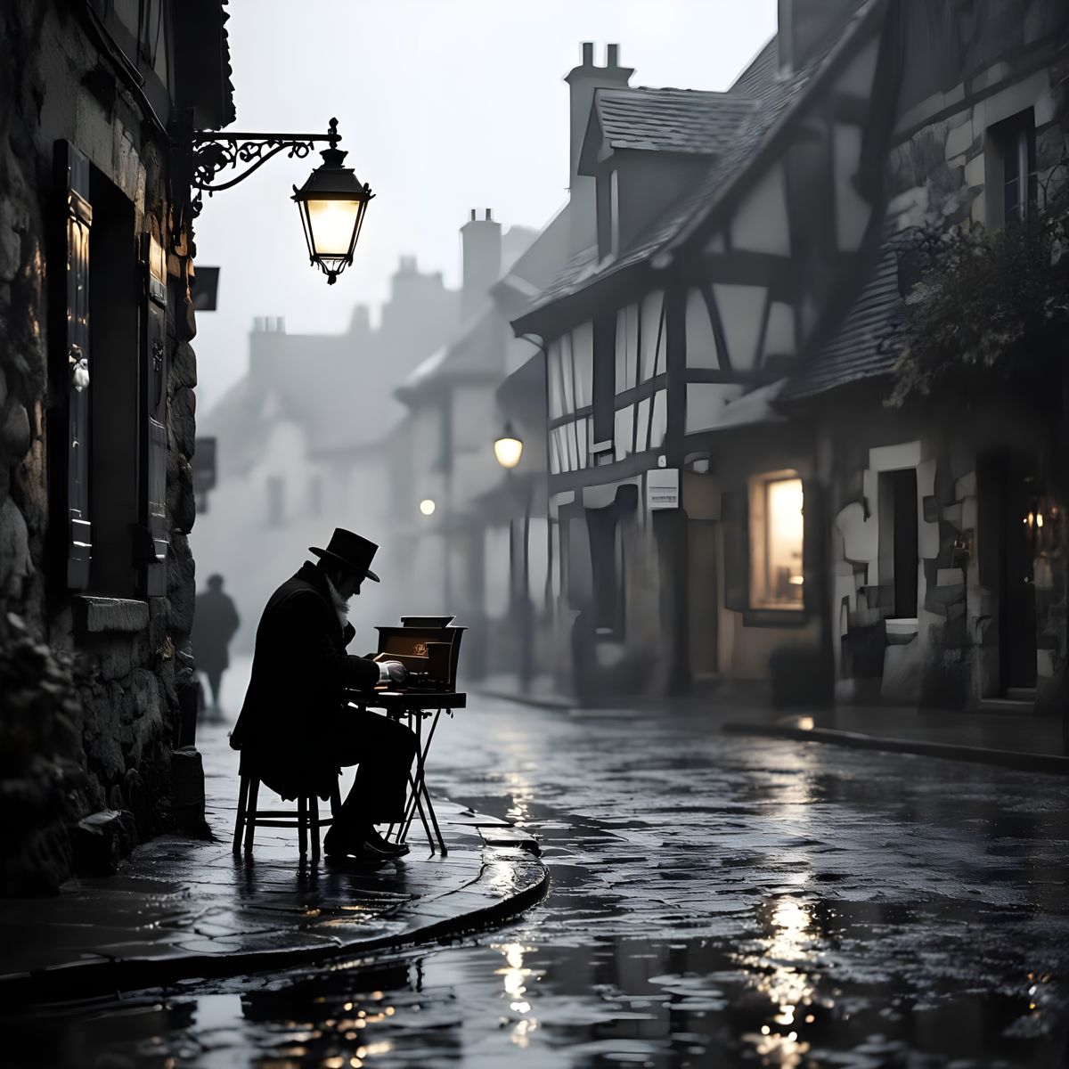 This image shows a grayscale street scene at night, with rain puddles reflecting lantern light. An organ grinder stands on a corner, rendered with blurry sfumato techniques.