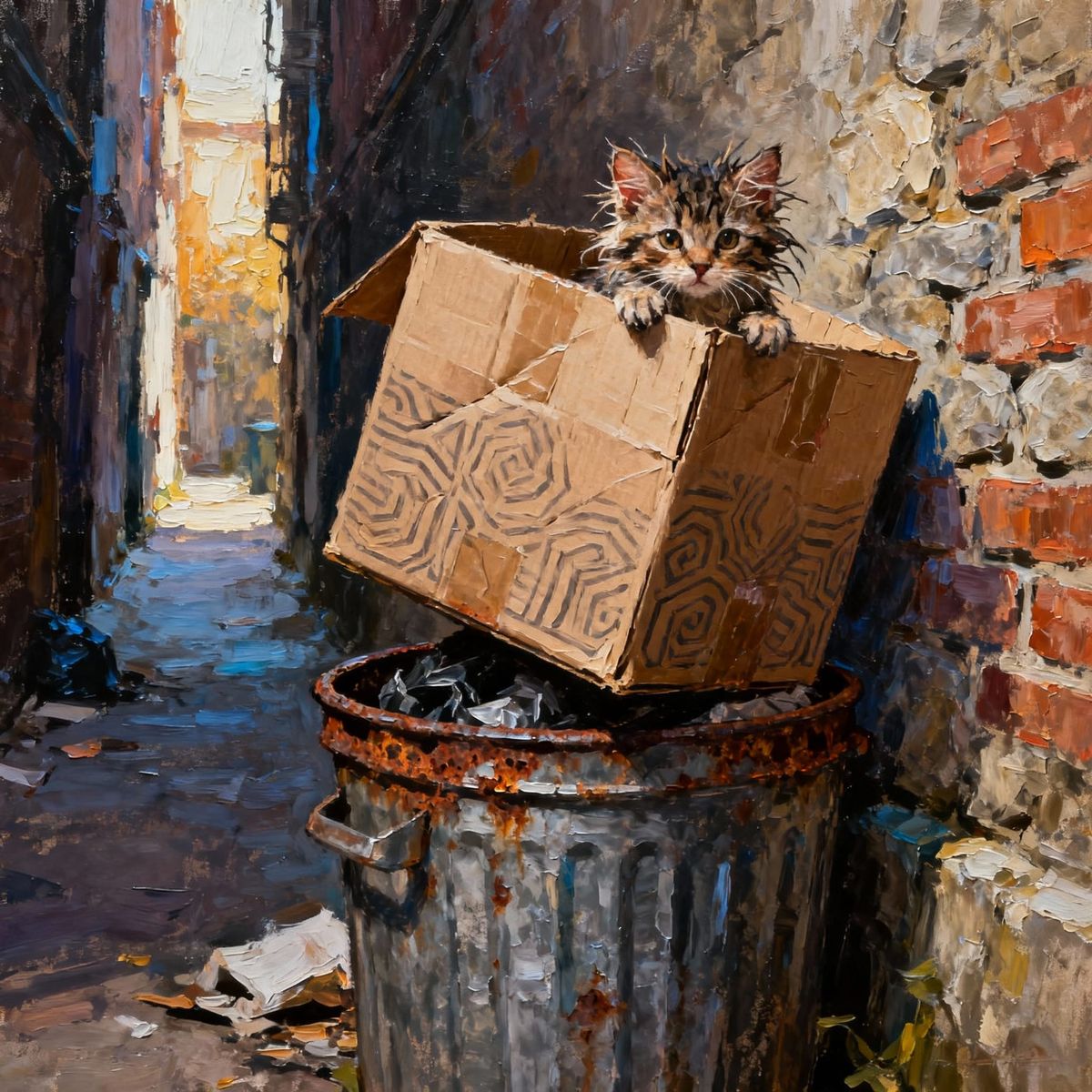 A disheveled kitten peeks from an intricately detailed cardboard box balanced on a trashcan in an alleyway, rendered with impasto abstract oil on stone texture.