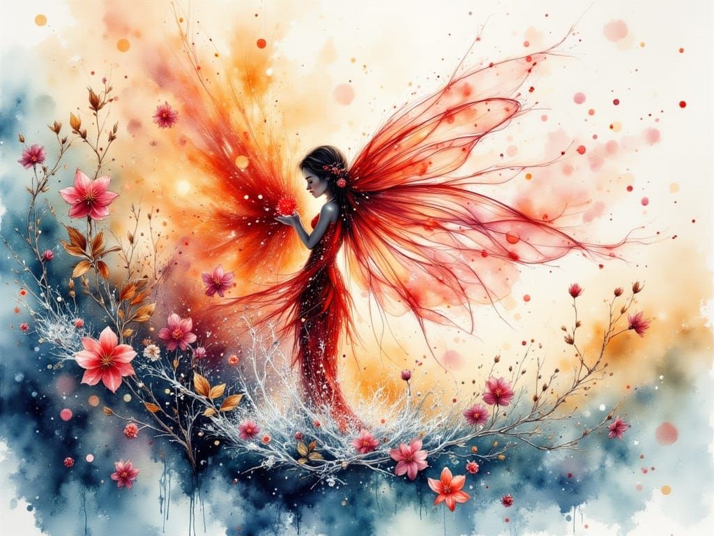 This image depicts a red ocean fairy with translucent, haloing colors, rendered in a wet-on-wet watercolor style with waves in the background.