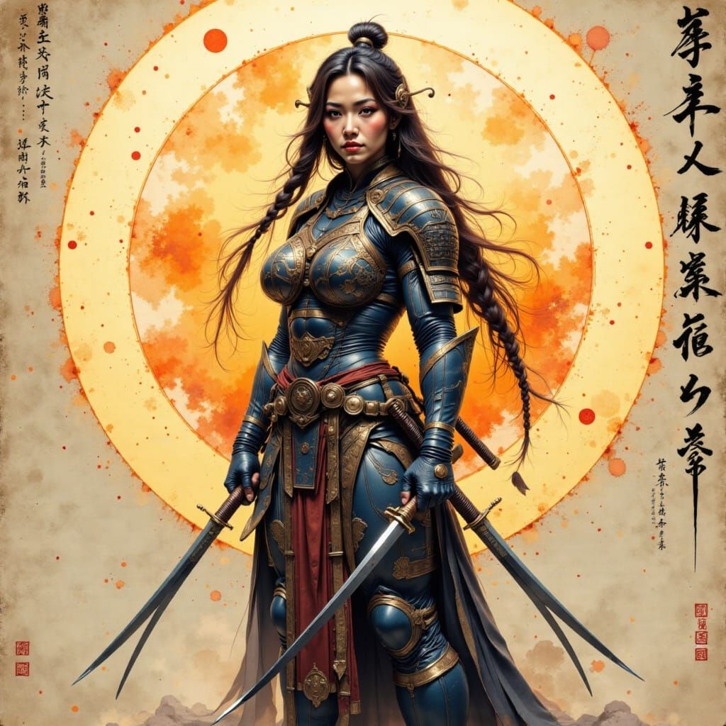 This image shows a beautiful, muscular female samurai with dark hair, wearing detailed blue and orange armor and holding two katanas. A glowing circle and aged paper texture create a dreamlike, painterly atmosphere.