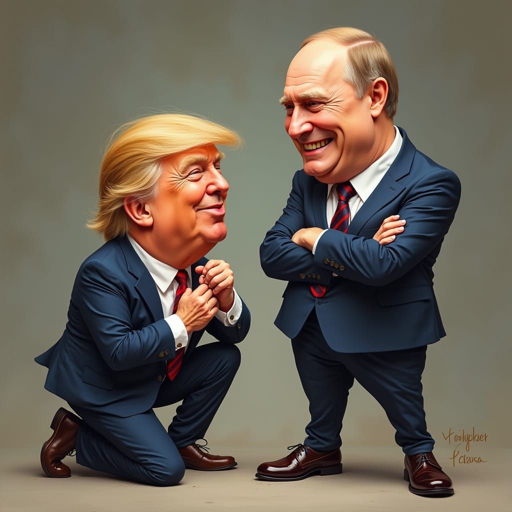 This image shows a caricature of a man with distinctive hair kneeling and licking the shoes of a confident man in a suit. It's a humorous political cartoon with bold colors and intricate details.