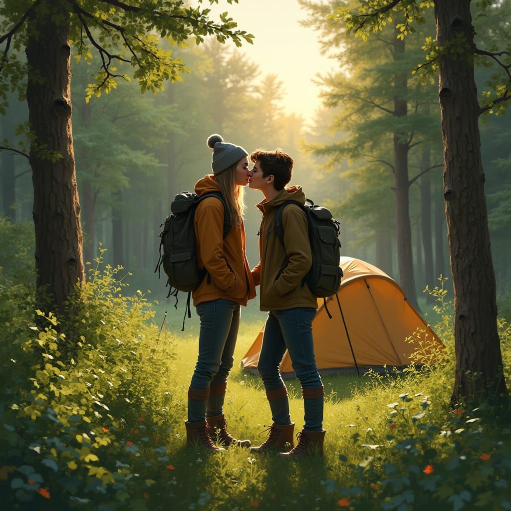This image depicts a serene forest scene of a young couple sharing a romantic French kiss, surrounded by lush greenery, tall trees, and vibrant foliage, with subtle hints of camping elements in the background, softly lit by the warm glow of sunset, reminiscent of 19th-century realism and dreamy landscape...