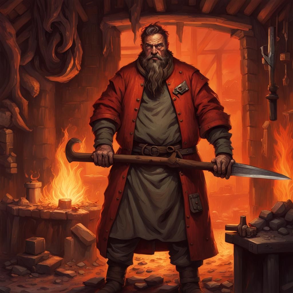 This image shows a burly, red-hued blacksmith from a Dungeons and Dragons setting. The smith, bearing forge scars, is depicted with a hammer and forging metals in detailed fantasy concept art.
