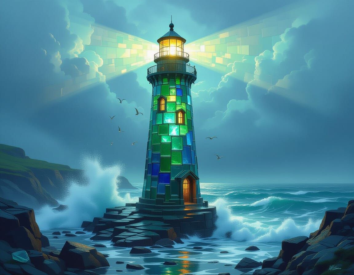 This image shows a majestic lighthouse made of colorful, sea-worn glass, standing against a stormy ocean. Its light beam is a cascade of glass fragments, with marine life sculptures on the cliffs.