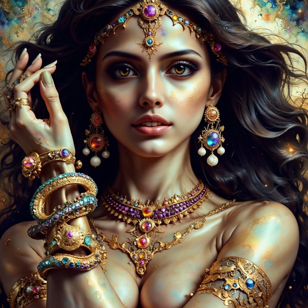 This image depicts a serene and enigmatic goddess of vital energy, surrounded by intricate carvings and soft, golden light, in a style blending Indian folk art with influences from dreamlike symbolism and vibrant, expressive colors.
