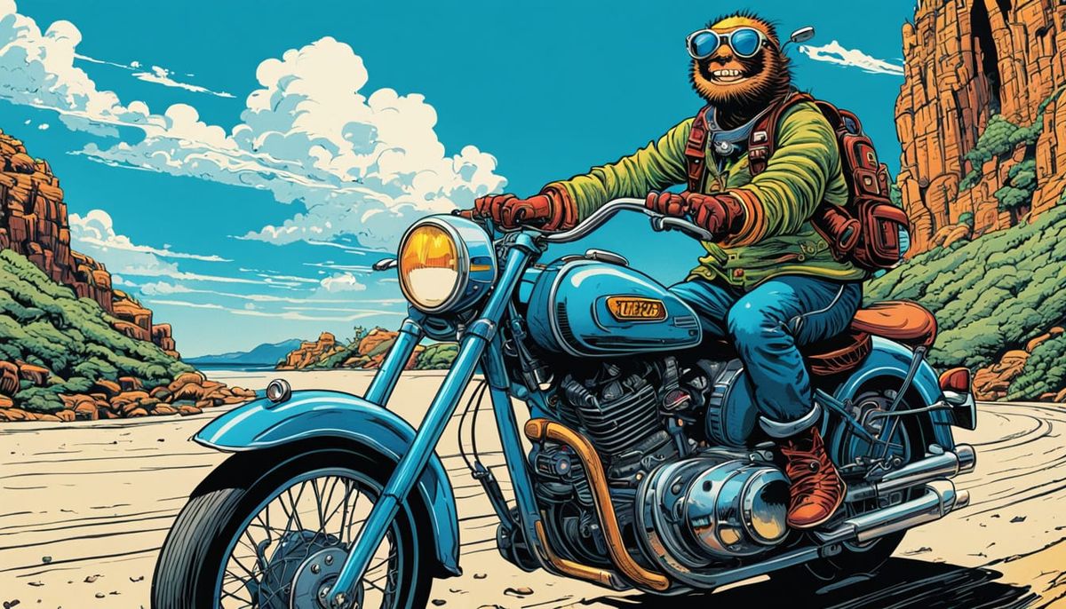 This image shows a caterpillar with sunglasses riding a vintage motorbike on a coastal road. The comic book art uses vibrant colors, dynamic contrasts and energetic lines to convey a sense of joy and adventure.