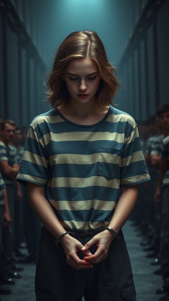 A young woman stands in a dimly lit prison hall, wearing a striped uniform and handcuffs, her expression somber and her gaze downward. The atmosphere is one of confinement and melancholy, with muted colors and dramatic lighting.