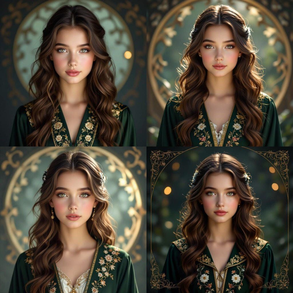 This image showcases a beautiful teenage girl in an elegant witch robe, bathed in soft golden light. The scene features a serene expression, detailed fabric, and subtle Art Nouveau influences, creating an ethereal atmosphere.